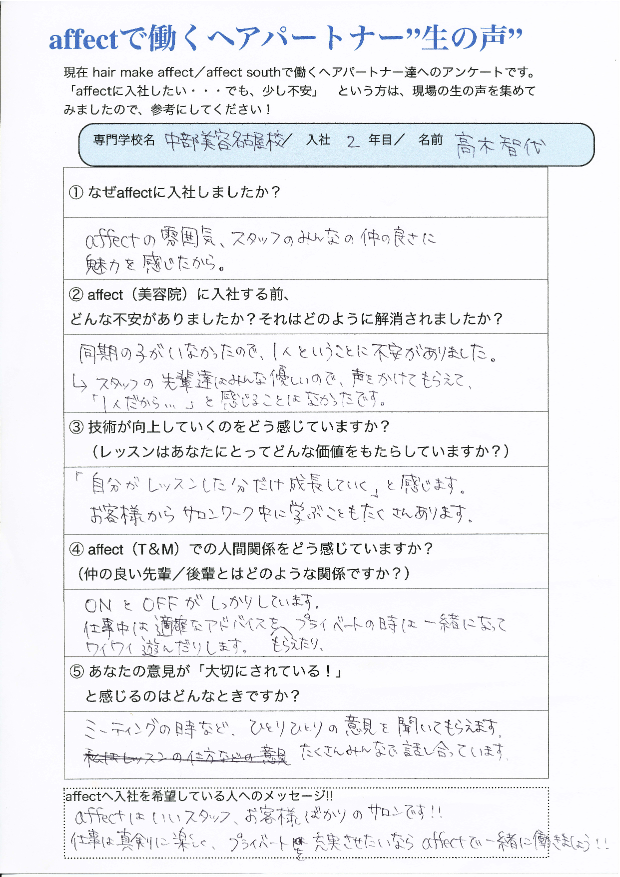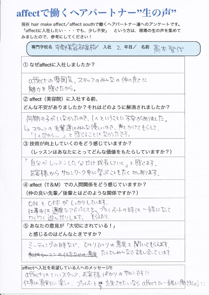 affectの雰囲気、スタッフのみんなの仲の良さに魅力を感じたから。