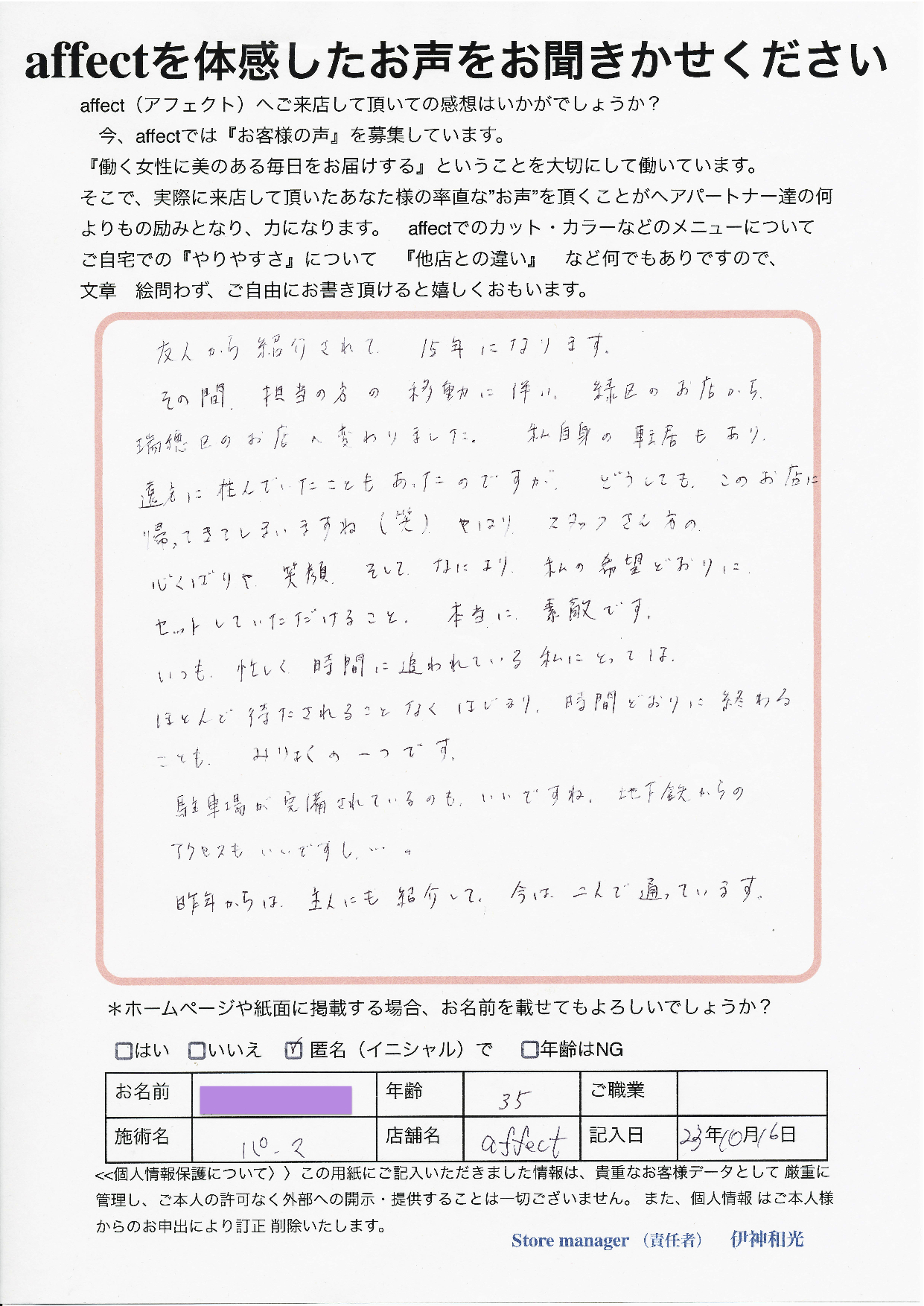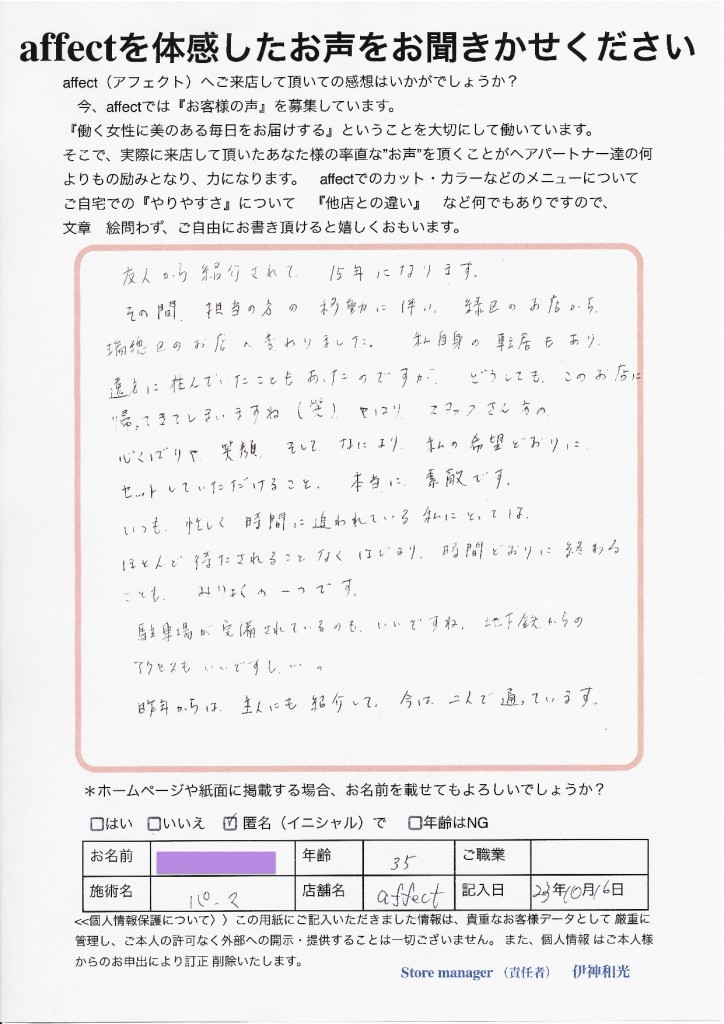 affectのヘアパートナーの心配りや笑顔 これは自然とでるものです。