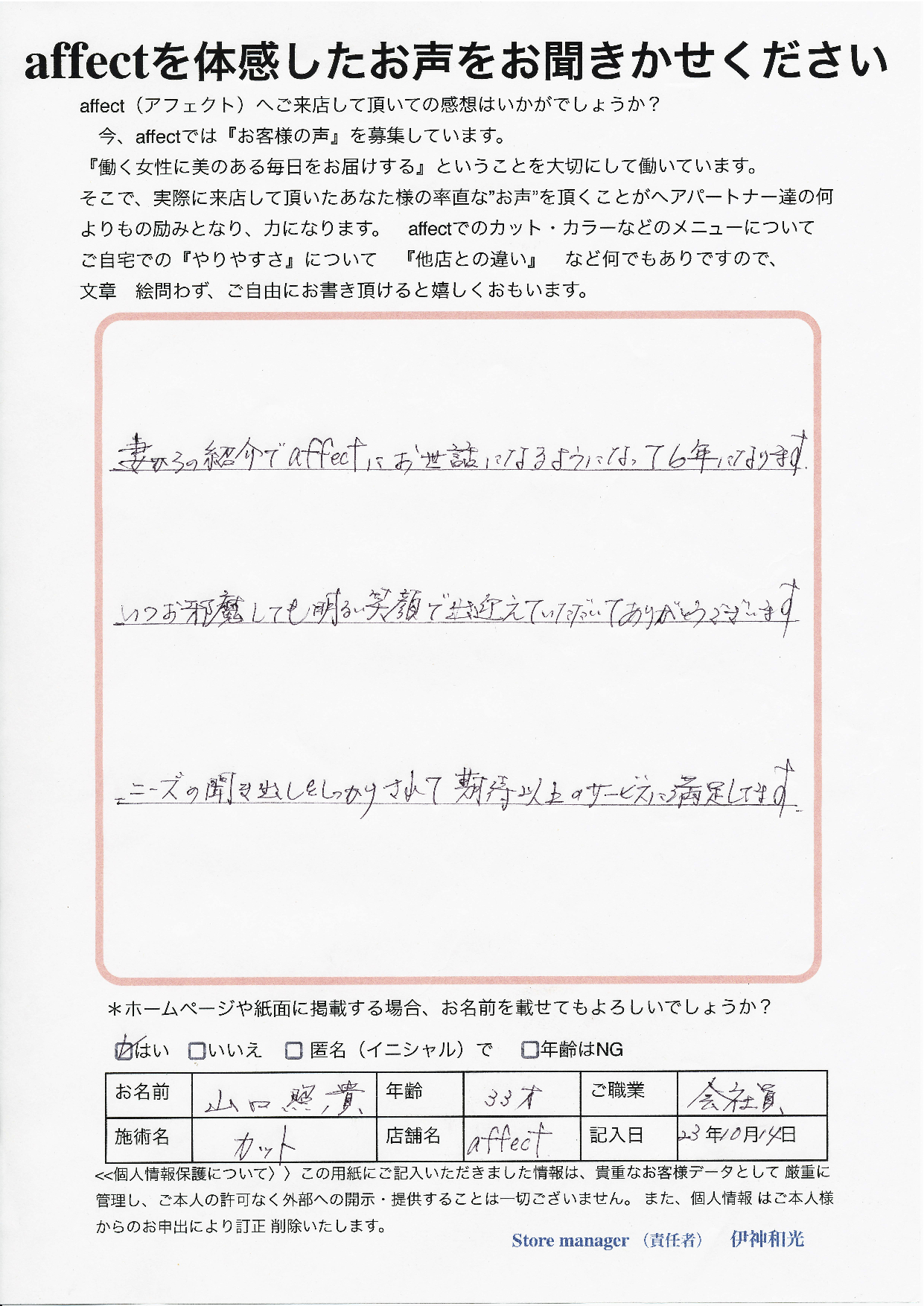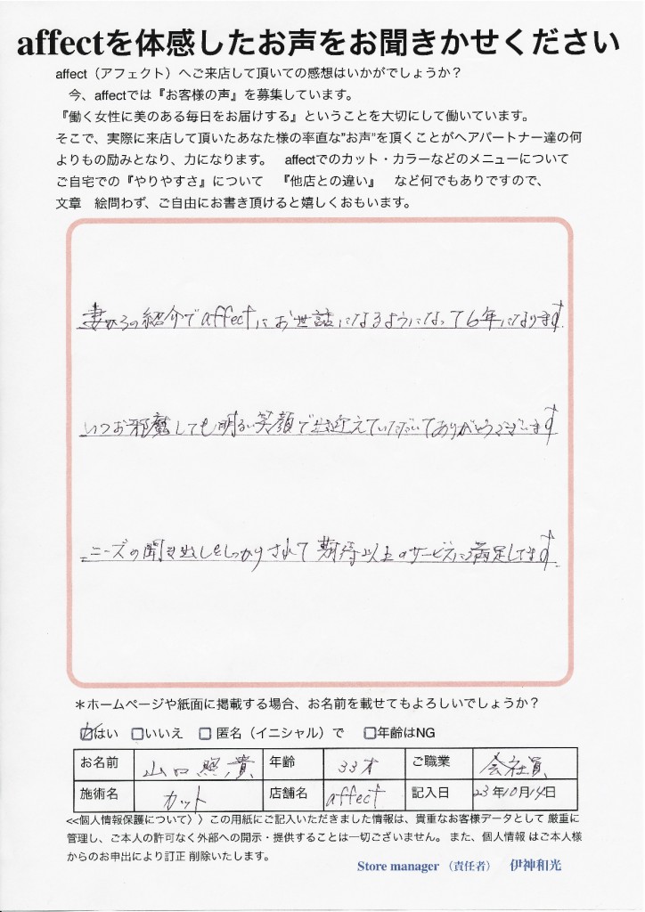 妻からの紹介でaffectにお世話になるようになって6年になります。