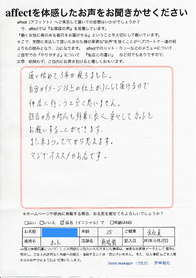 K.K様のライフスタイルに合わせたヘアデザインをこれからもご提案していけるように、