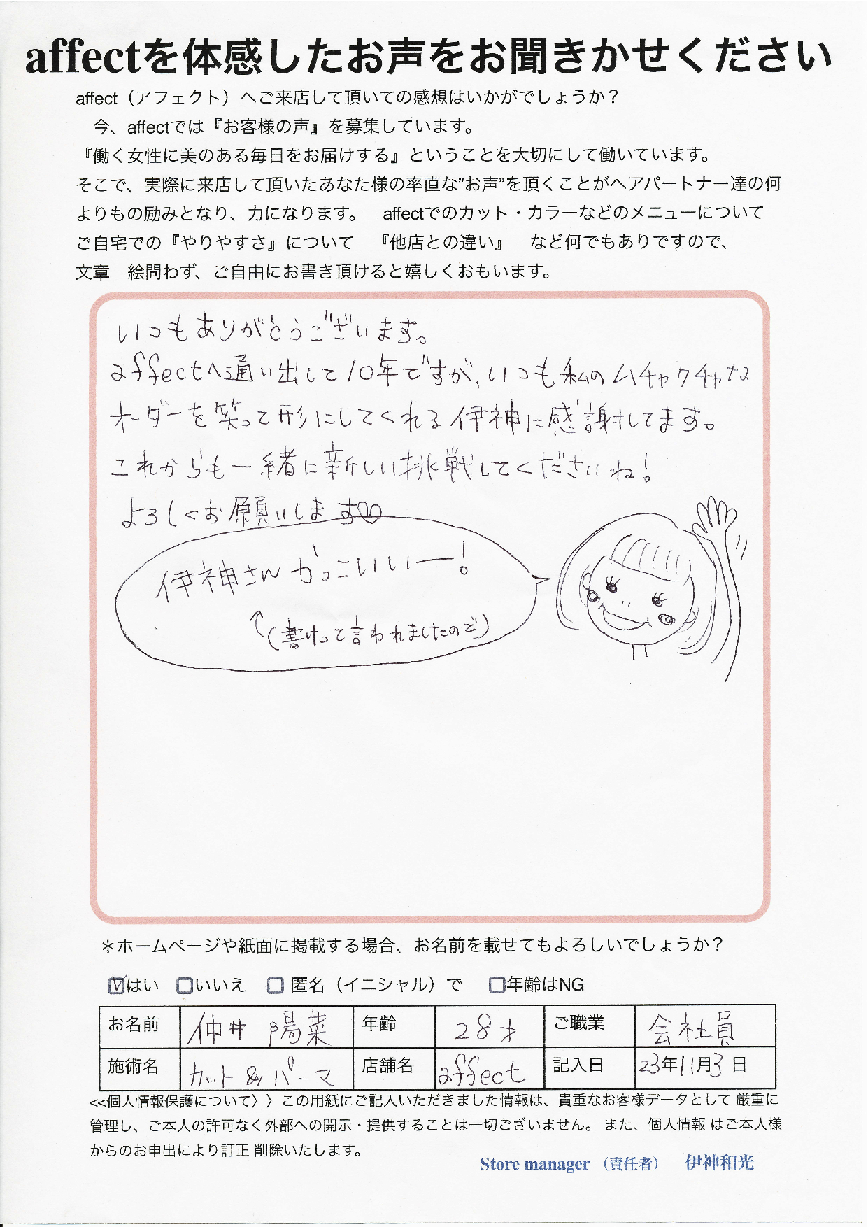 陽菜さんの”感性”とaffectの”感性”がいつも共に刺激し合い、数々のヘアデザインを楽しんでこれたことに感謝します。