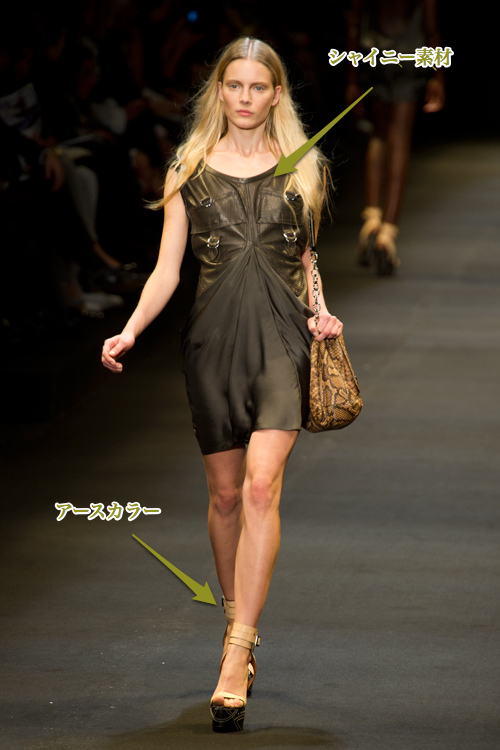 素材をシャイニーなものでまとめたり、バイオレットやオレンジ、また今春トレンドの
