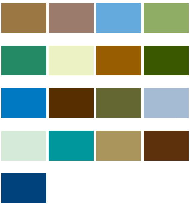 大地や空、緑、海を感じさせる地球の色の組み合わせ。緑系と青系が中心とした色