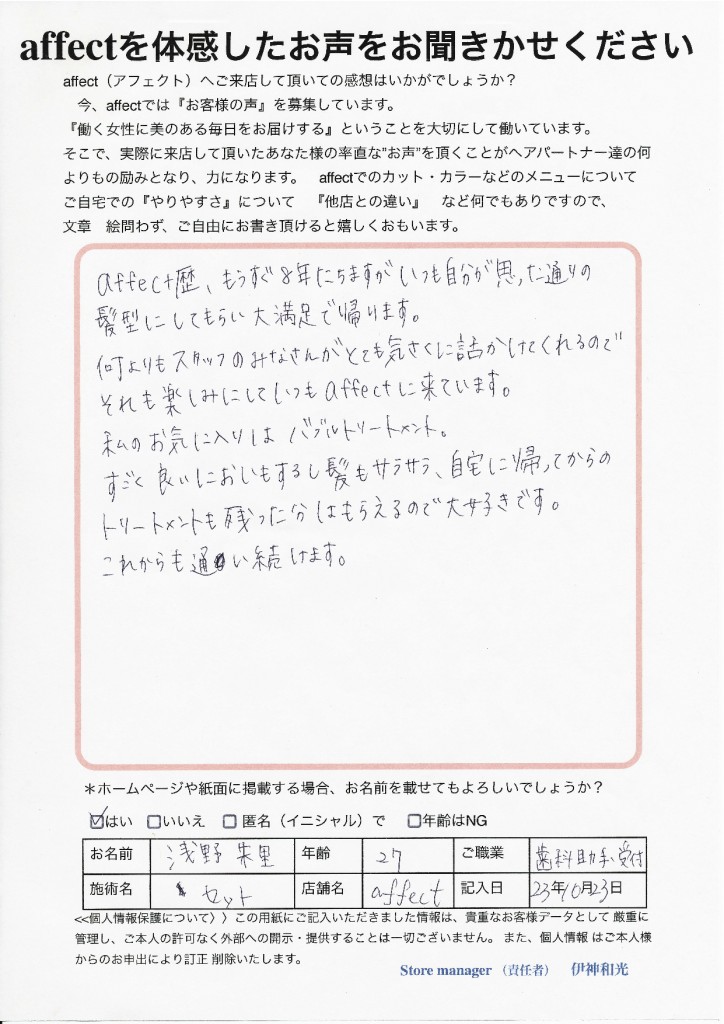 これからも、サロンで 自宅で! affectと一緒に浅野様のヘアーを大切にしていけたらと思いますのでよろしくお願いします。