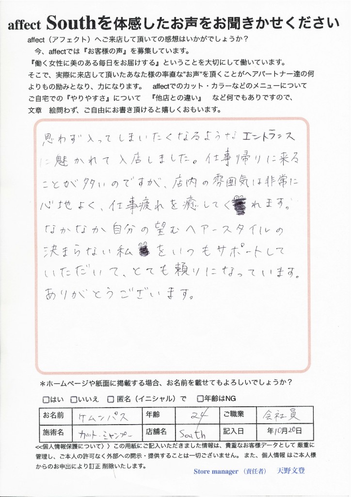 ケムンパス様が感じていただいている癒し・・・これはaffectsouthの大切なテーマです。