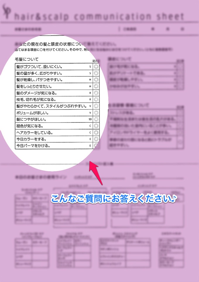 このシートに応えて頂くと、お客様にあったシャンプー&トリートメントを使用できます。