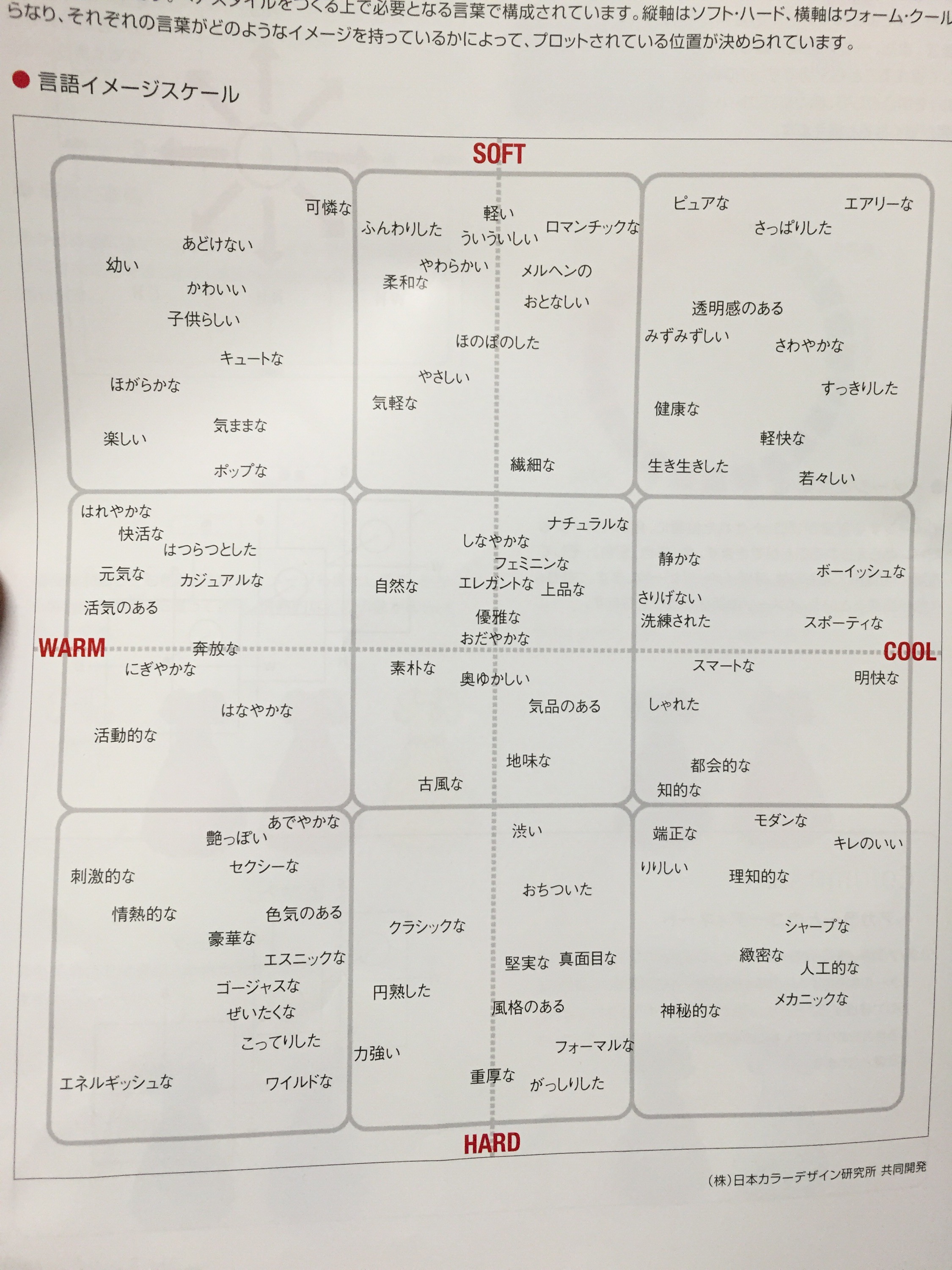 人が色を見て感じるイメージには、ある程度共通性があるみたいで、 自分がその言葉から感じるイメージと、一般的なイメージが あっているのかを言語イメージスケールという表を使って確認しました!!