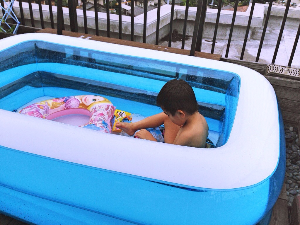 と言う前置きですが今日は日曜日〜朝から子供がプールをしたいと言う事で曇りのなか我が家もテラスでプール開きです(笑)