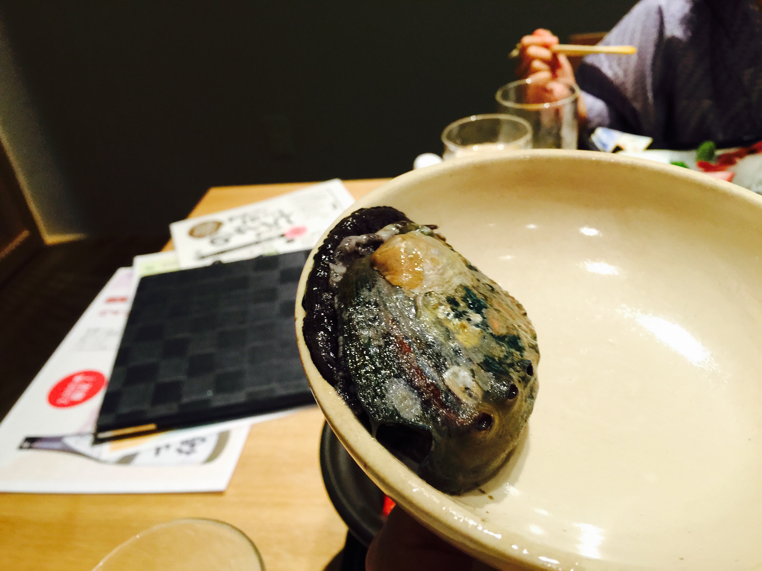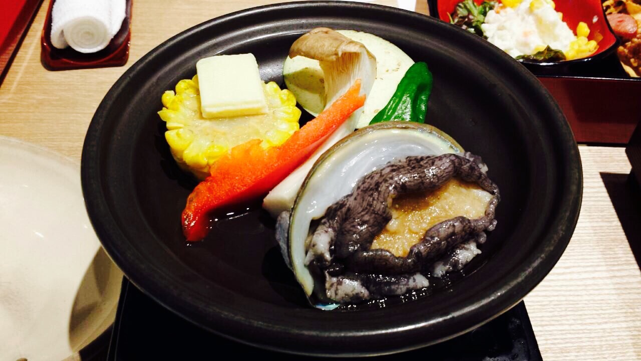 お料理に戻りママと子供達が「わぁ〜アワビ生きてるぅ」