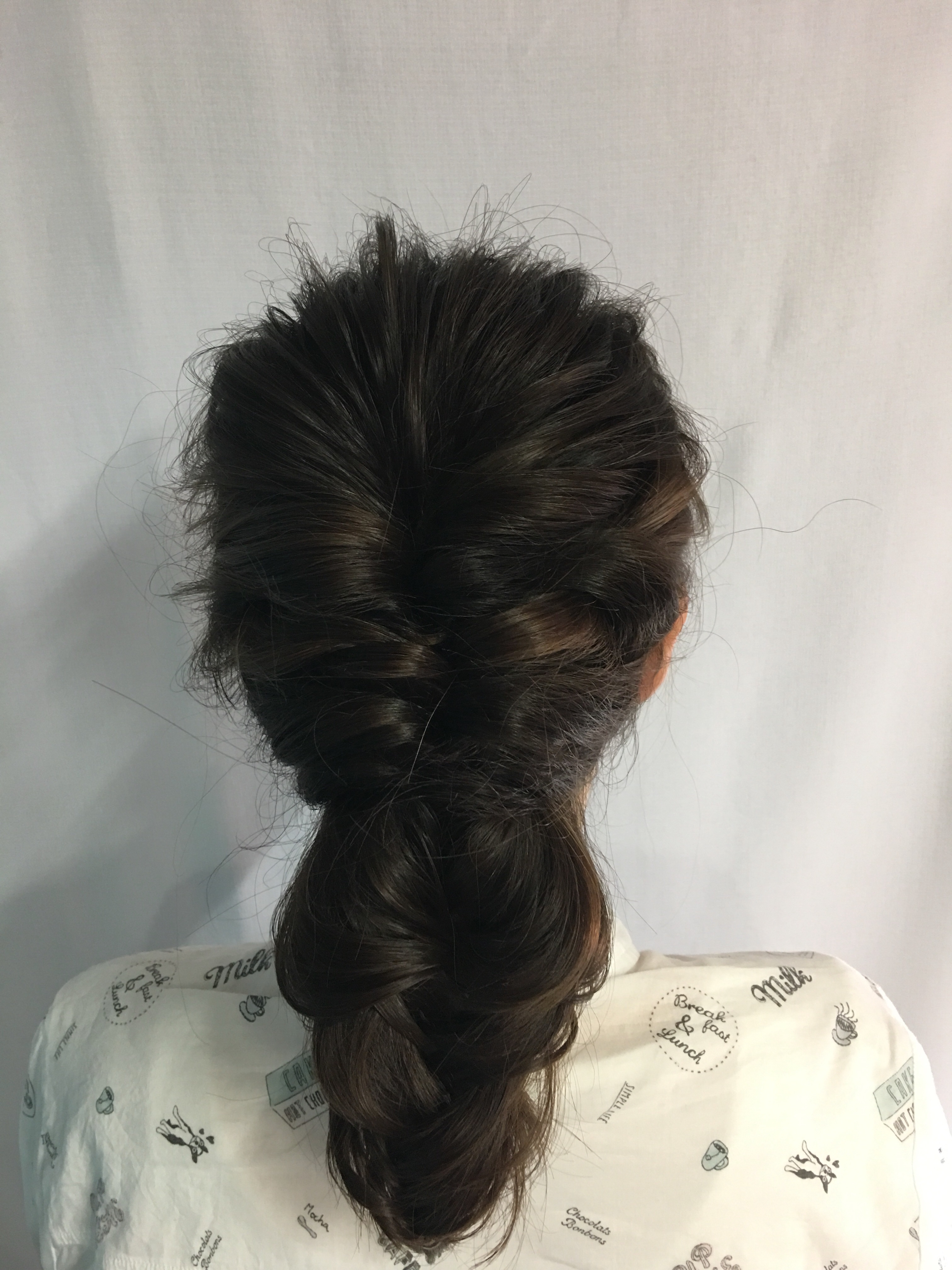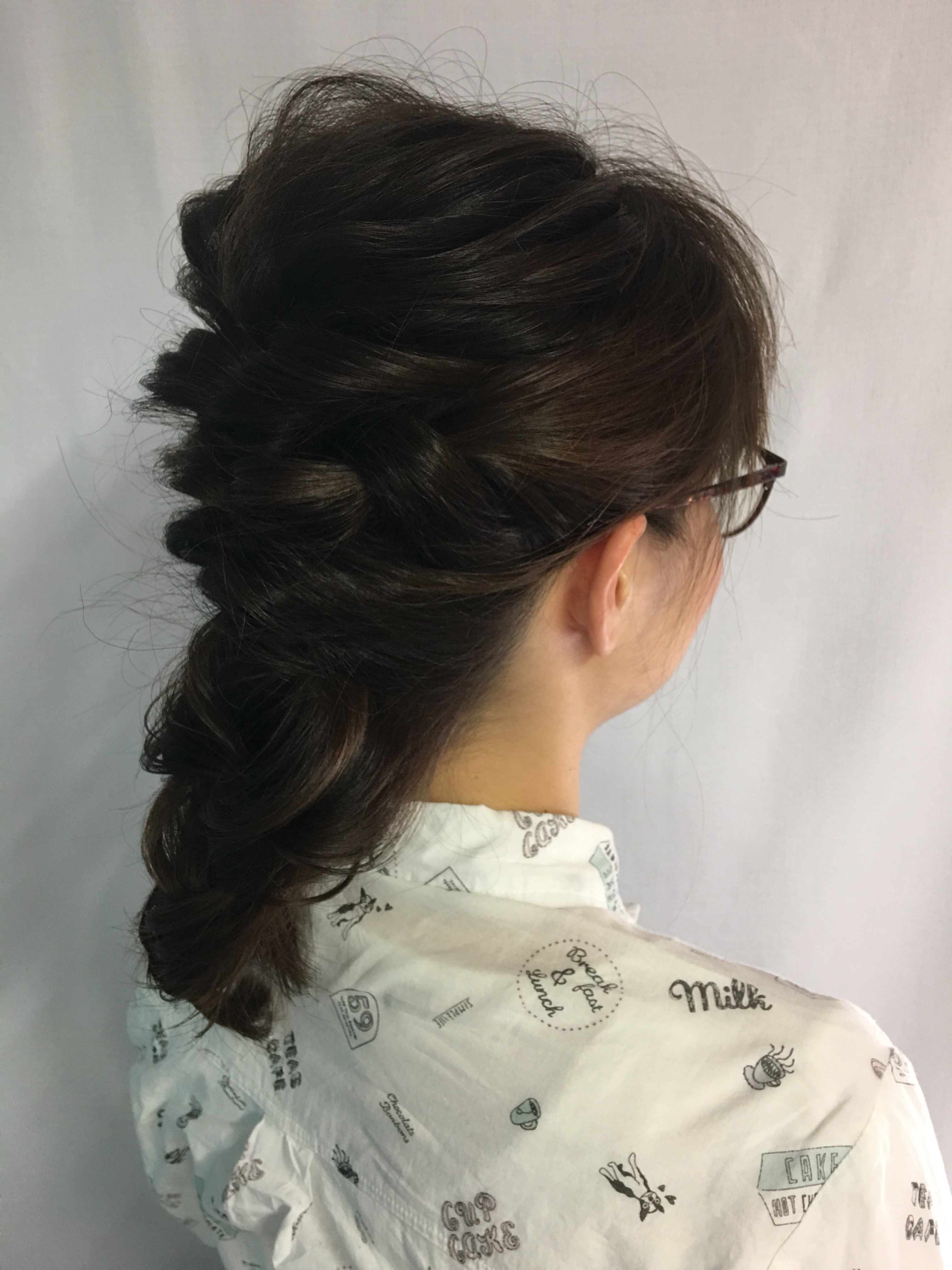 毛先だけを巻いて、バックに三ヶ所クルリンパを入れて余った毛先に大きめにフィッシュボーンを入れています!