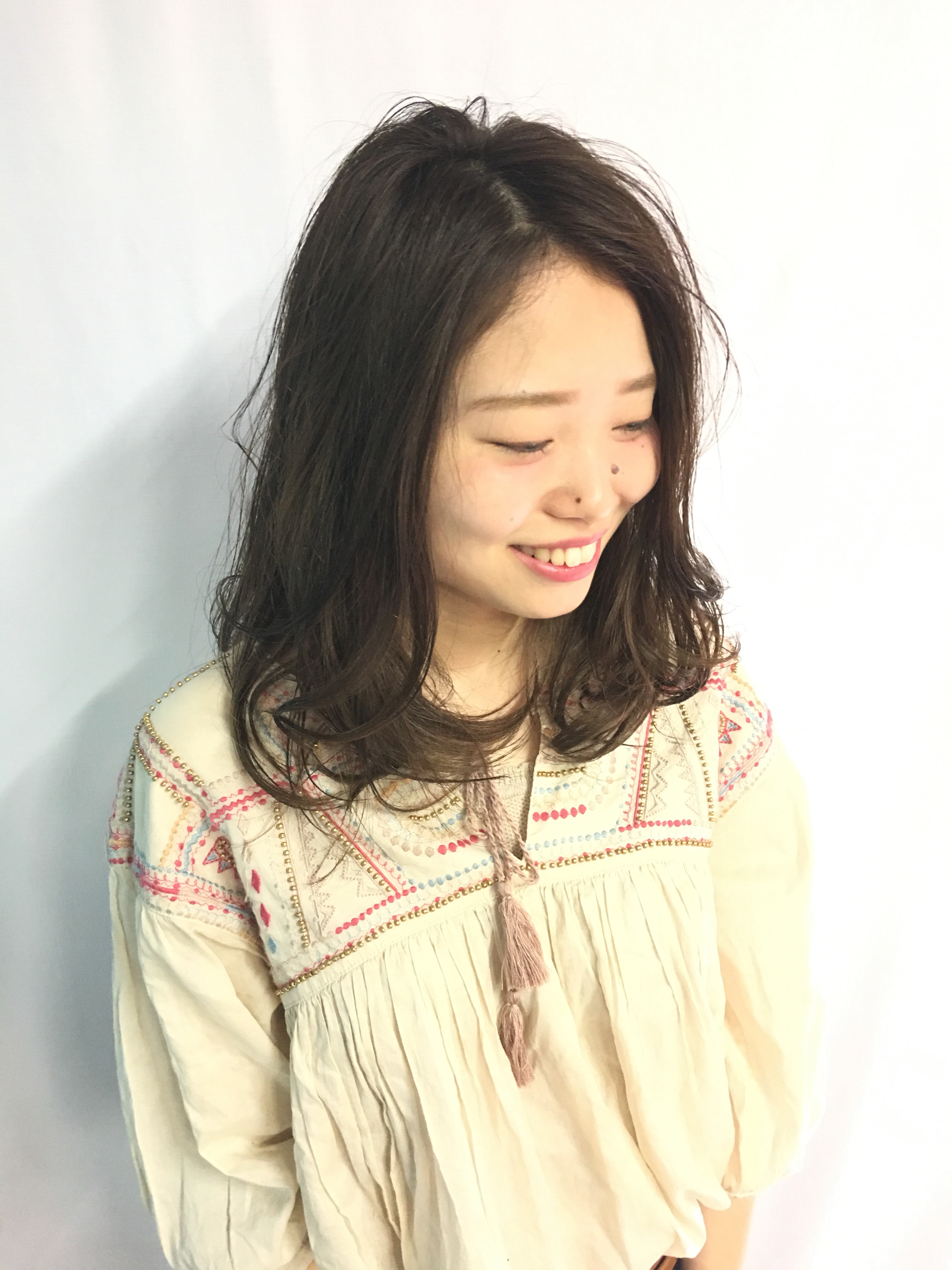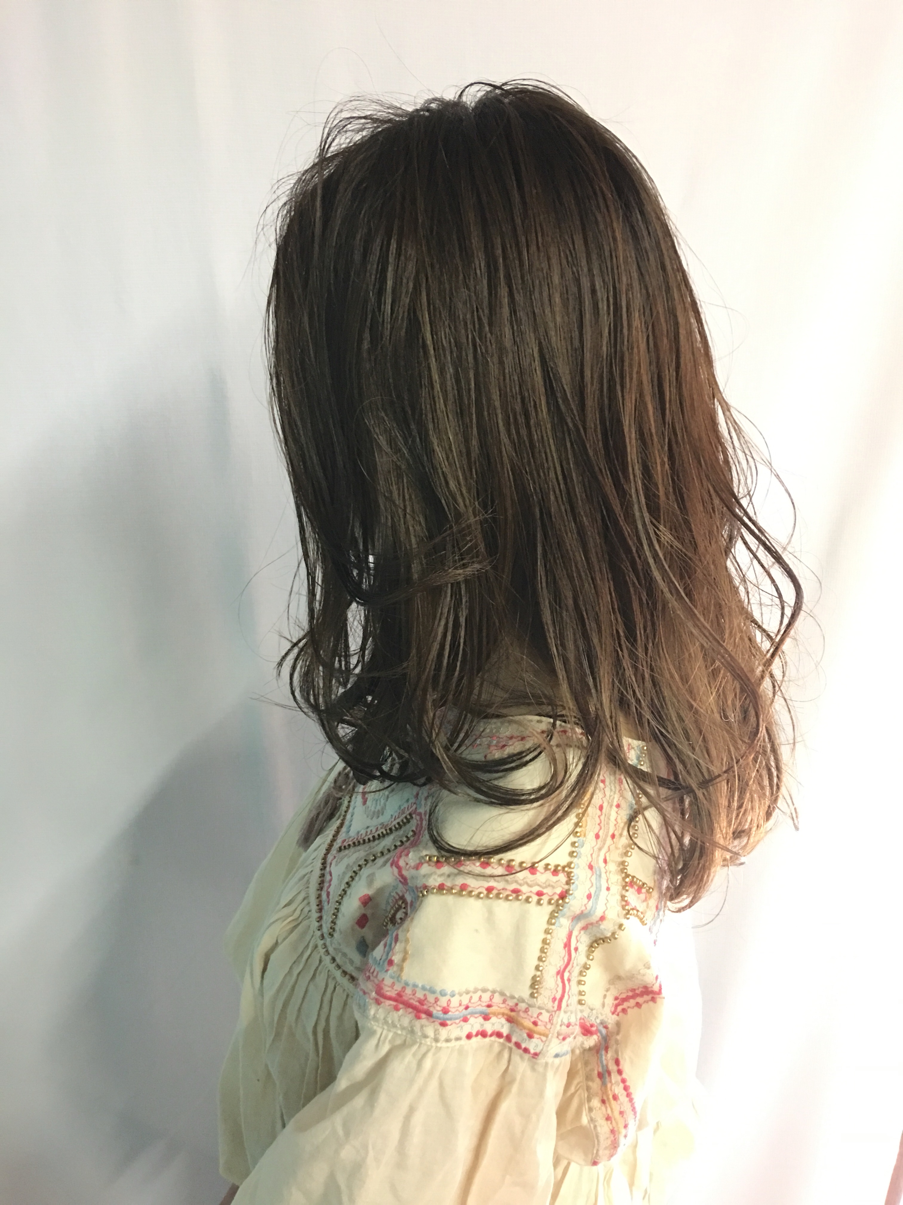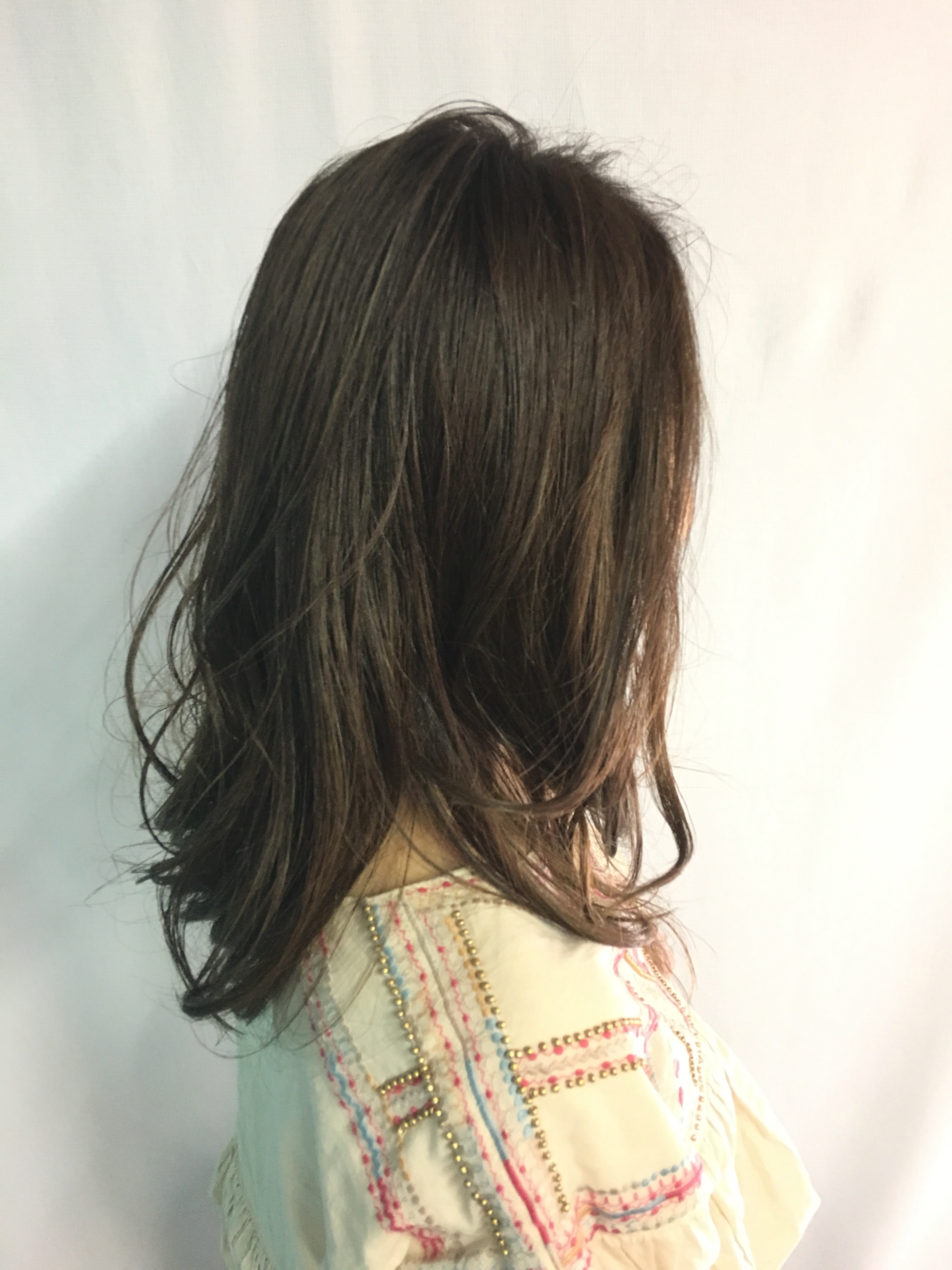 長さはセミロングぐらいで長さは変えずに重たいところの量感をとってカットしています!