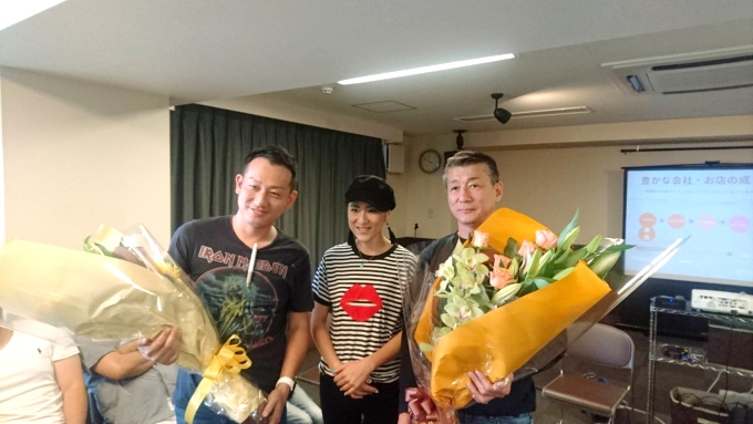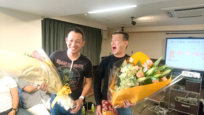 妻の若江もえちゃんが、ボクのワークショップ中に花束を持って駆けつけたの巻き。